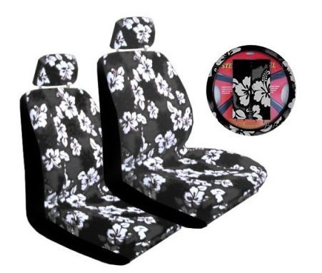 Charcoal Universal-fit Hawaiian Hibiscus Floral Print Low Back Front Bucket Seat Cover with Separate Headrest Cover, Steering Wheel Cover and Shoulder Seat Belt Pads Combo